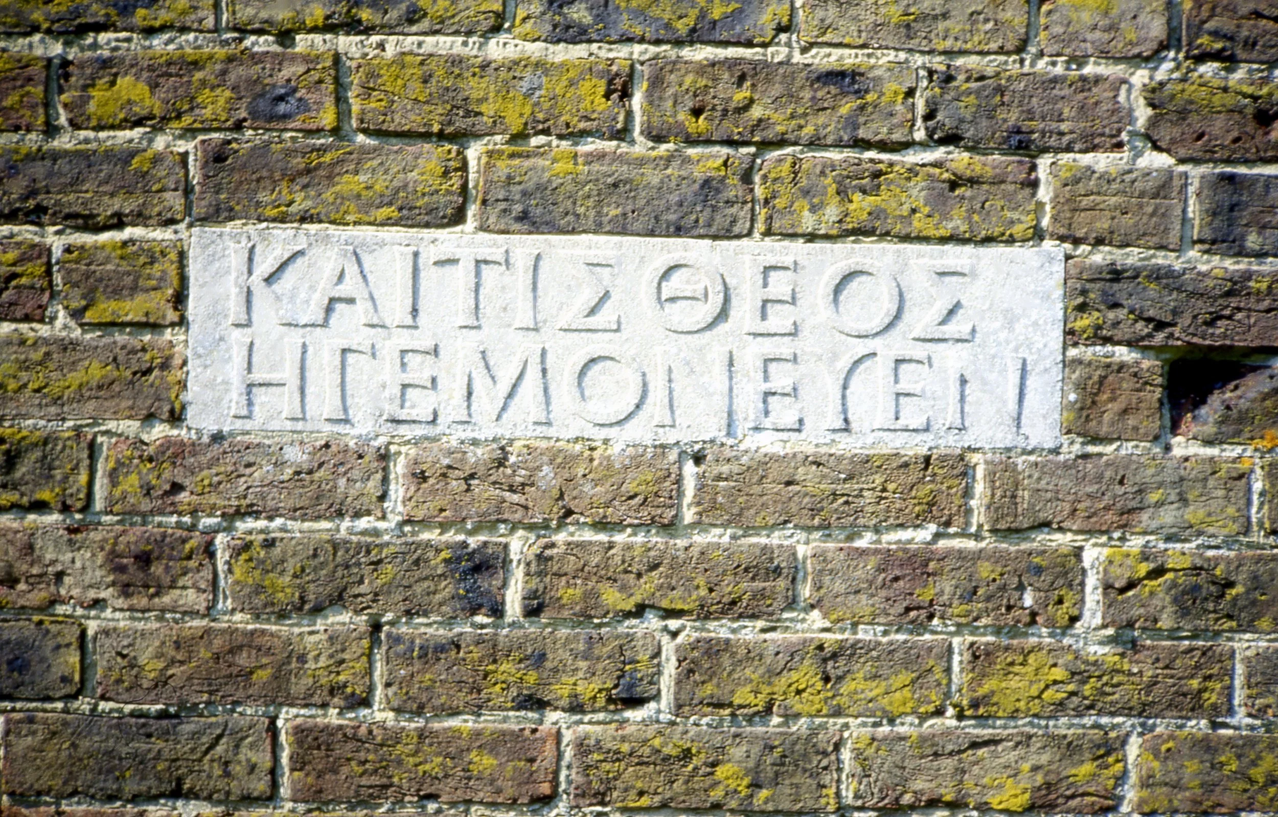 The Greek is from Homer, ‘Some God led us here’, carved by D. Chute.